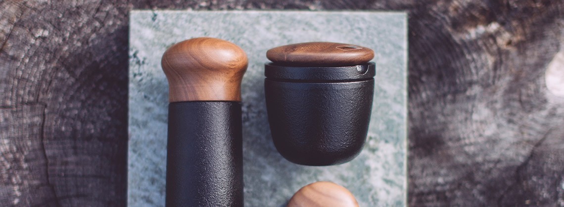 Salt & Pepper shakers 8 cm. Cast iron with walnut lid. Design Carl & Carl.